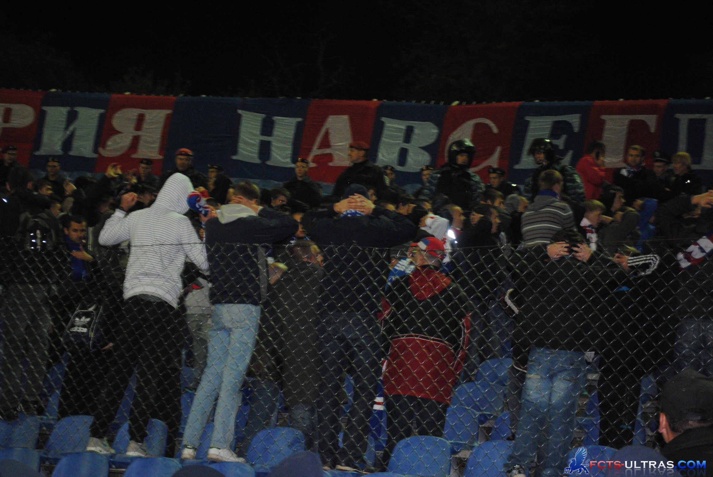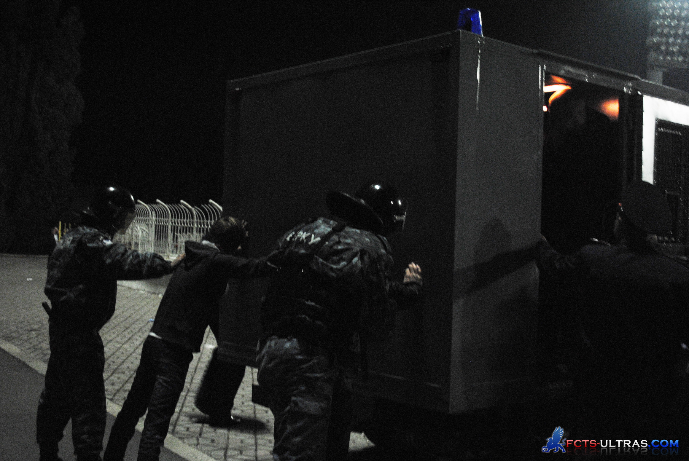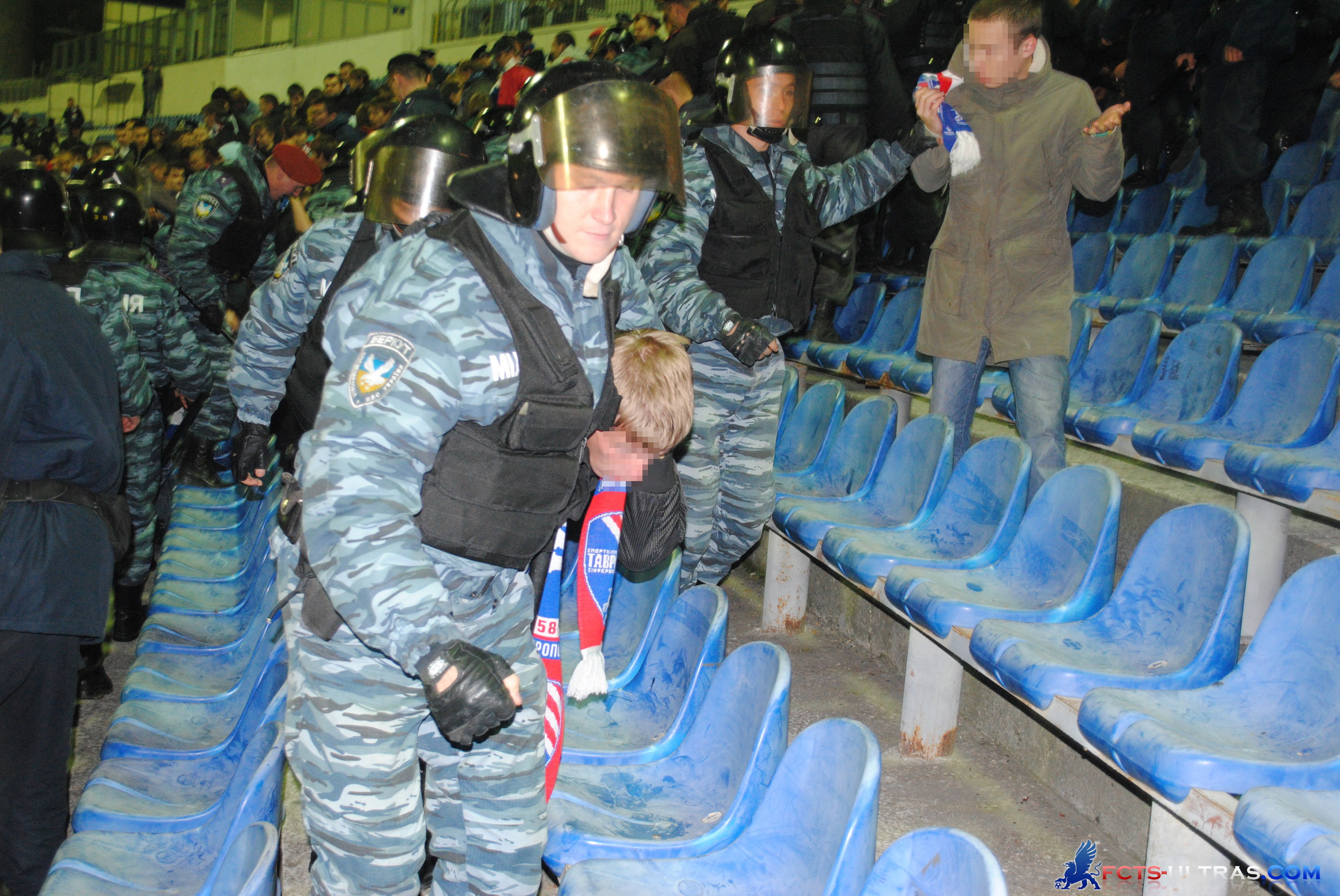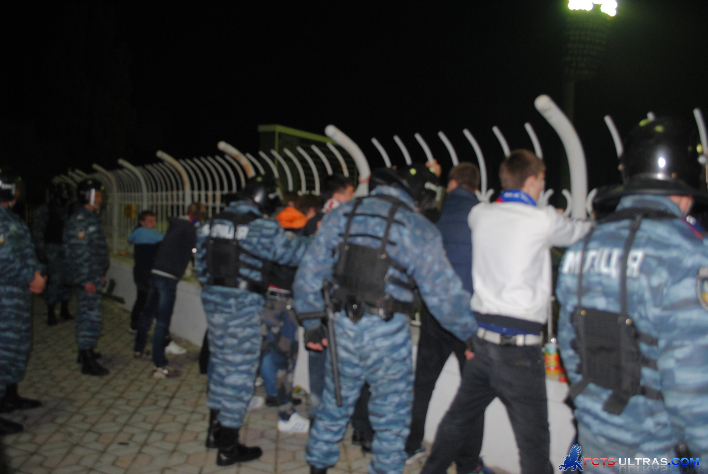 • Когда мы полностью насладились атмосферой и решили выйти из сектора, ребята Беркута наверное перепутали нас с недавними киллерами из Чечни, которые не так давно фестивалили в г. Одесса, но наши аргументы - мол мы не знаем чеченского, не подействовали и строгие ряды беркута пошли в бой, наверное помня недавние события в городе Одесса, на фанатов, сжимая кольцо оцепления со всех сторон.