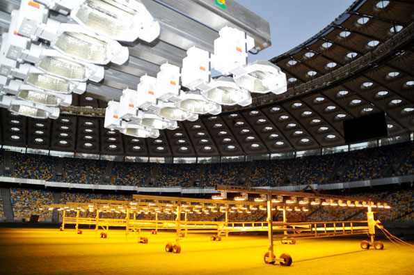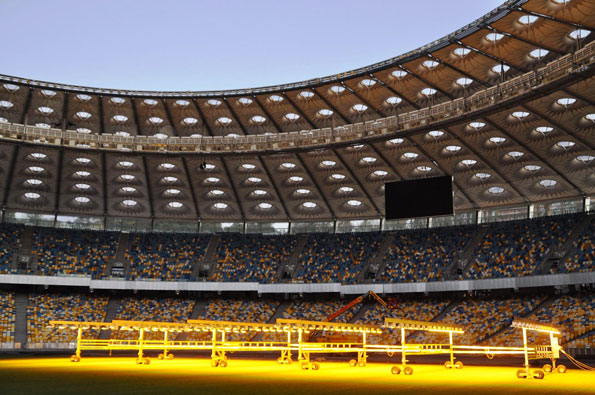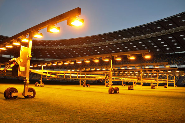 На полі НСК «Олімпійський» встановили три мобільні освітлювальні установки, які замінюють природне сонячне світло для газону у осінню та зимову пори року.