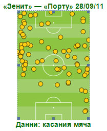 В матче с «Порту» Данни перемещался по всему полю (см. схему ниже). Чтобы увеличить свои шансы на хороший результат в среду, футболистам «Шахтера» нужно ограничить этого разыгрывающего в пространстве для действий и не позволять ему подолгу владеть мячом.