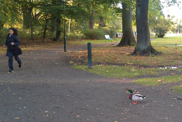 Вообще, обилие спортивных сооружений в городе впечатляет. Во время прогулки по Мальмё были обнаружены несколько футбольных полей, масса спортивных площадок, регбийный стадион и т.д. Живописные парки изрезаны беговыми и вело - дорожками. На улицах тротуары и переходы оборудованы велосипедными дорожками, трафик на которых может посоперничать с автомобильным движением. Причем на велосипедах едут все: старики и дети, мужчины и женщины, белые и выходцы не из Швеции, и обязательно в велошлемах. Велосипедистов в городе не просто много, а очень много! Самым колоритным вело-персонажем, которого я видел, оказался бомж, неспешно руливший по одному из парков на байке с багажниками, полными вещей.Здесь же многочисленные бегуны, накручивающие круги вокруг озер в парках, аккуратно оббегают местную живность в виде уток, которые неспешно разгуливают по дорожкам. Мальмё – город спортивный!