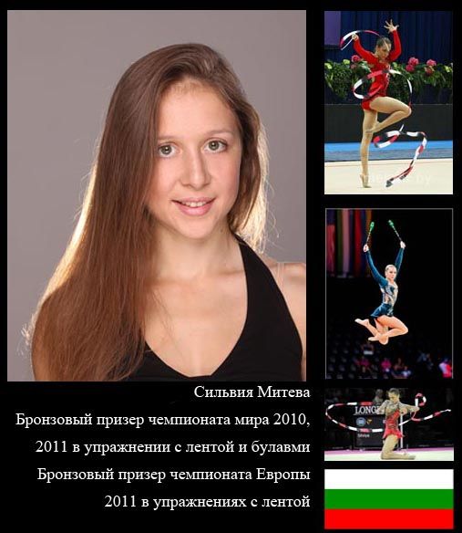 Сборную Болгарии представляет Сильвия Митева. Сильвии 25 лет, ее гимнастика – это сочетание женственности и богатых традиций болгарской школы. Митева – бронзовый призер чемпионатов мира в упражнениях с лентой (2010, 2011 гг) и булавами (2011 г).
