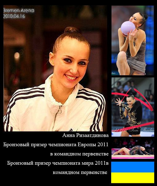 Второй номер сборной – Анна Ризатдинова, представительница крымской школы художественной гимнастики. Визитная карточка гимнастки – красивейшие повороты со сменой формы на высоком полупальце. Ане одинаково хорошо удаются и современные постановки, и лирика, и фолк-мотивы. К сожалению, на последнем чемпионате Ризатдиновой не удалось занять одно из 15 мест. Гимнастки, занявшие первые 15 мест, получили олимпийские лицензии. Надеемся, что Анне удастся завоевать лицензию на предолимпийской неделе в Лондоне, которая пройдет в январе 2012 года.
