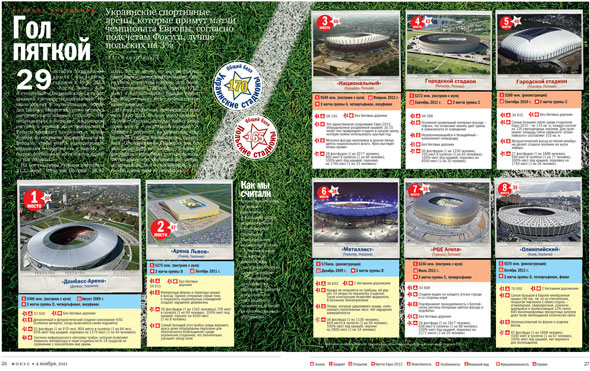 Из всех стадионов, готовящихся принять Евро-2012, больше всего баллов у «Донбасс-Арены», которая имеет лишь один минус – маленький паркинг. А худшим в рейтинге, на удивление, стал главный стадион чемпионата – столичный «Олимпийский». Парковки для болельщиков здесь нет вообще, туалетов и фастфудов – мало (если учитывать количество зрителей). Внешний вид непримечательный, да и с «изюминкой» у киевской арены тоже не сложилось.