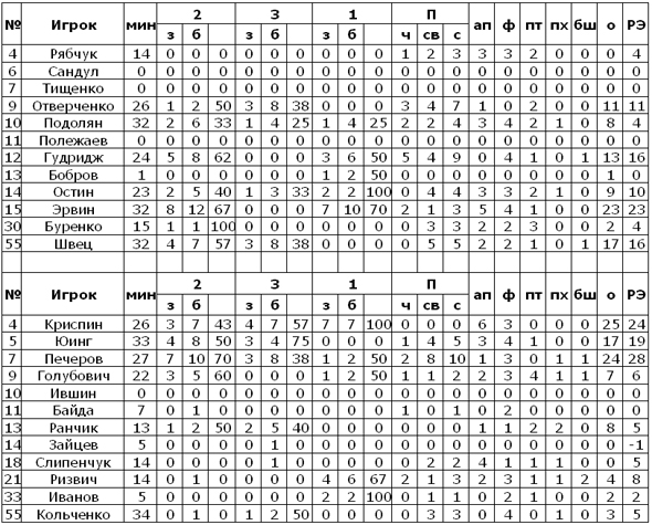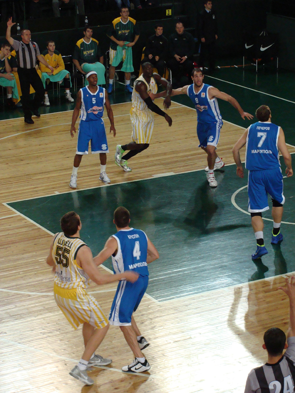 После точного дальнего броска Ранчика гости повели 0:3, на это «волки» ответили уверенным рывком 8:0, в котором приняли участие Гудридж, Эрвин и дважды Швец. Спустя минуту Голубович на пару с Печеровым счёт сравняли, но не надолго. Швец и Эрвин снова вывели вперёд БК Киев – 26:20. Вторая десятиминутка получилась достаточно равной, киевляне продолжали лидировать, удерживая «Азовмаш» на расстоянии в 6-8 очков. Следует отметить, что хозяева паркета имели полный контроль в трёхсекундной зоне. Прыгучий Гудридж то и дело оставлял Ризвича без мяча во время борьбы за подборы. Заброшенный Криспином дальний бросок под занавес четверти установил окончательный счёт первой половины – 47:43 в пользу БК Киев. Третья десятиминутка стала не менее яркой. Тандему «больших» киевлян Остин-Гудридж удалось полностью закрыть трёхсекундную зону, что полностью нейтрализовало переднюю линию «Азовмаша».