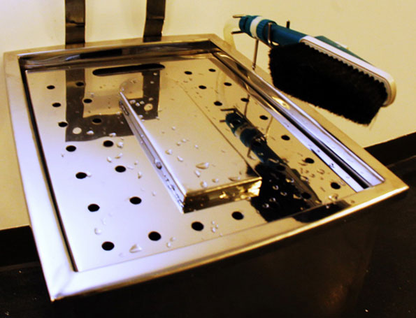 Посреди комнаты расположены две пары мойок для бутс. Одна из них со специальной подставкой и щеткой, другая - выглядит просто как обычная раковина.