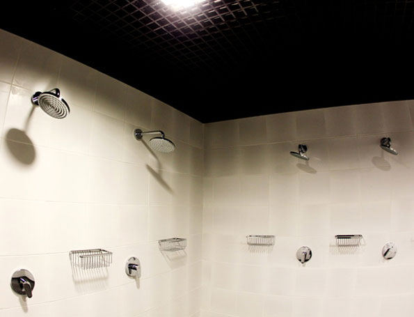 Из общего помещения раздевалки вглубь стадиона идут 2 прохода. Один ведет к левой душевой комнаты и туалетов, другая - к таким же помещений, но в правой части. Между душевыми красуется джакузи, наличие которого является также обязательным с медицинской точки зрения. «То что в раздевалке есть две зеркальные душевые комнаты, а также идентичные санитарные узлы с левой и правой сторон, дает возможность при необходимости переформатировать одну большую раздевалку в две. К ним даже предусмотрены отдельные входы», - рассказали в пресс-службе стадиона. О душевых комнат, у них, как и в раздевалке, поддерживается удобный для игроков температурный режим. Одна душевая за раз может принять до десяти футболистов. В свою очередь, одним санузлом одновременно могут пользоваться до семи человек.