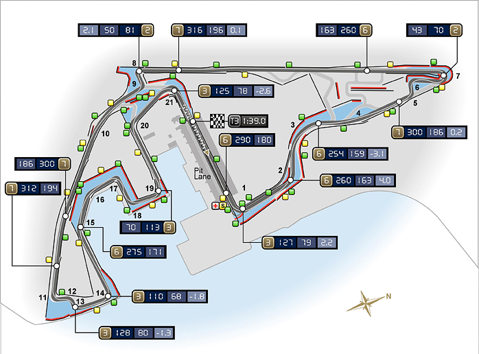 Дебютна гонка відбулася тут два роки тому. Траса збудована на штучному острові Яс вийшла доволі суперечливою, адже з одного боку ми бачимо дві досить довгі прямі та інтенсивні зони гальмування наприкінці них, з іншого весь третій сектор – це суцільний набір досить повільних поворотів, які проходяться на другій-третій передачах. Та найголовнішим є те, що в попередні два роки глядачі відверто нудьгували, марно очікуючи побачити бодай якусь адекватну кількість обгонів. Звісно минулого року всі напружено дивилися чим закінчиться боротьба Алонсо з Петровим, яка з кожним наступним колом віддаляла іспанця від практично гарантованого третього титулу, та напружений нерв моменту не приховав того, що з трасою варто щось робити. Власники навіть оголосили про майбутню перебудову, але подивившись на те, як добре цього року шини Pirelli і DRS сприяють збільшенню обгонів вирішили нічого не міняти.