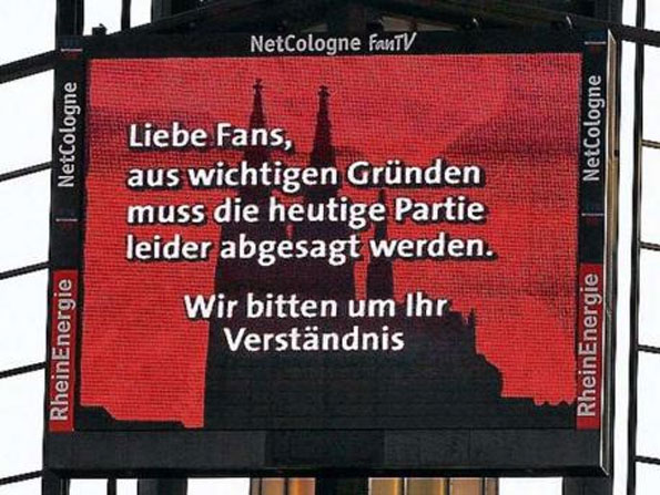 14:50. Футбольные команды Кельна и Майнца проинформированы. Оба коллектива покидают стадион.