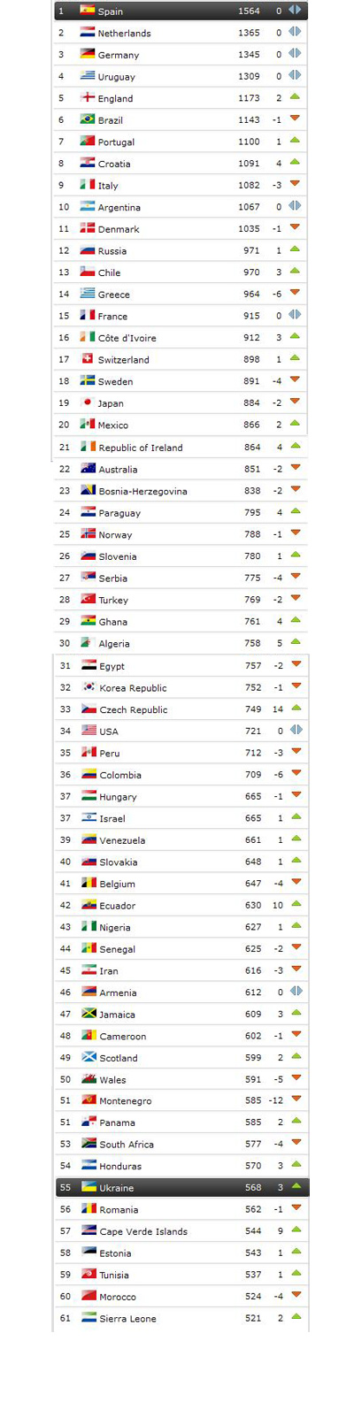 Сегодня ФИФА опубликовала рейтинг сильнейших сборных мира, в котором наша сборная Украины поднялась на три строчки и ныне занимает 55 место, упустив вперед Гондурас, Армению и другие команды.
