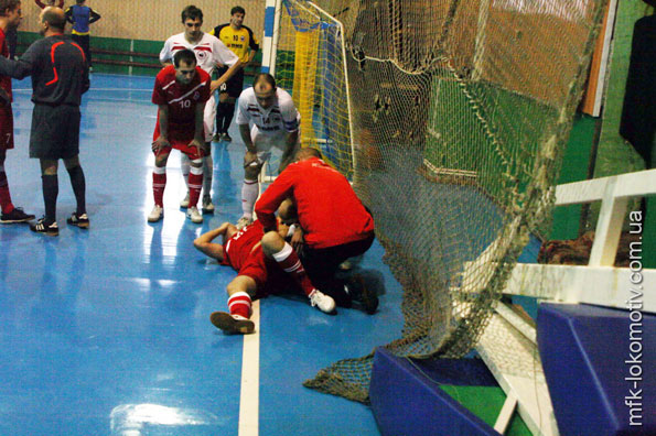 Как мы уже сообщали, субботний матч чемпионат Украины по футзалу среди команд Экстралиги между «Енакиевцем» и «Локомотивом» был омрачен неприятным инцидентом. На 28-й минуте игрок «Локомотива» Дмитрий Клочко после прохода по правому флангу сделал передачу вдоль ворот, после чего после контакта с игроком «Енакиевца» на полной скорости врезался в передвижной баскетбольный щит, находившийся в двух метрах от площадки (в этом же зале проводит тренировки БК «Донецк»).