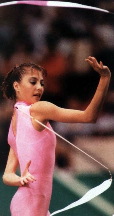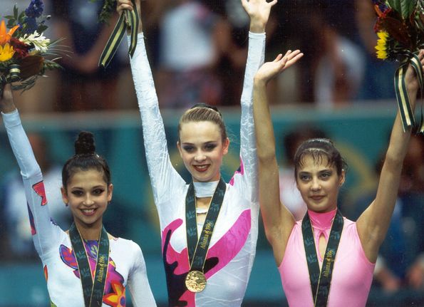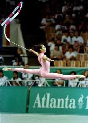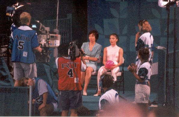 Я хочу уточнить Лену в одном моменте. Когда Я. Батыршина потеряла ленту, я видела это по мониторам, которые стояли в разминочном зале. И, когда я увидела, как Я. Батыршина сделала ошибку, зная бойцовские качества Лены, я сказала: «Лена, у тебя есть шанс побороться». Она, действительно, в таких ситуациях не пугается, а мобилизуется и вдохновляется. Лена вышла на ковер, здорово сделала ленту. И это была достойная финальная точка! Зрители это оценили, среди них было много участников Олимпиады, которые закончили свои выступления. Они начали аплодировать Лене за ёё бойцовское выступление. Когда открыли оценку, она, конечно, не соответствовала этому выступлению. По трибунам разнеслось «Ах!» – вздох зрительских разочарований. Тут же началась церемония награждения. Кто-то из зрителей бросил нам флаг Украины. На олимпийском пьедестале стояли две украинские грации, звучал гимн Украины, поднимались два жёлто-голубых флага. Замечу, что четырьмя годами раньше, на Олимпиаде в Барселоне, на пьедестале тоже стояли две гимнастки Украины. И никто не ожидал, что новым украинским звёздам удастся сохранить эту традицию. Для нас к счастью это получилось. В будущем такую традицию все наши соперники всеми силами старались сломать.