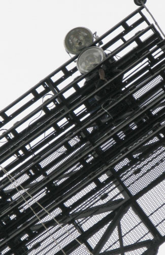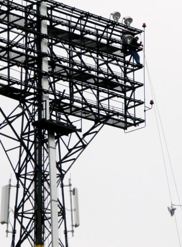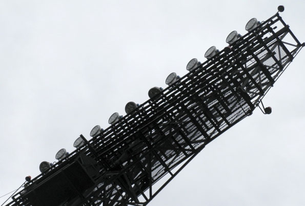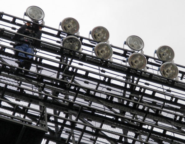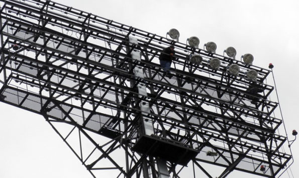 Напомним, что ранее были демонтированы старые светильники, после чего была проведена определённая работа с футбольными мачтами.