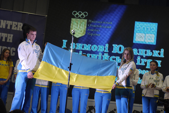 Згідно з традицією, яка існує вже багато років, учасники попередніх Ігор передають своїм наступникам, яких відряджають на чергову Олімпіаду, прапор України. Урочисту місію передачі прапора виконала молодий посол на I зимові Юнацькі Олімпійські ігри Катерина Дерун.