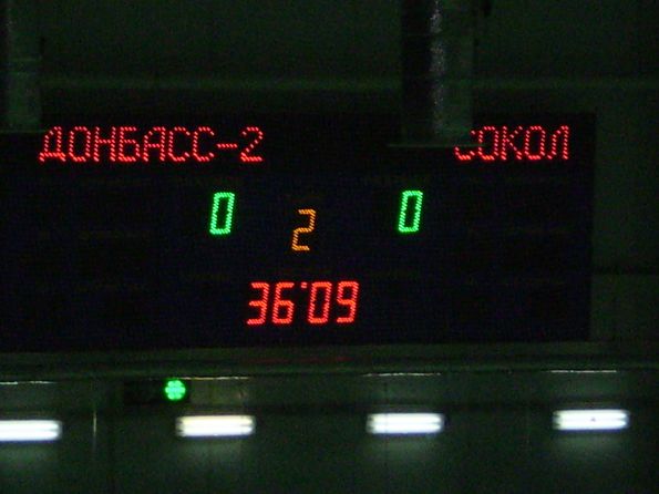 Ну, и вкратце расскажу о том, что творилось после, но сфотографировать, к сожалению, уже не предоставилось возможным. Постепенно к началу поединка болельщики начали заполнять трибуны, расположенные на втором этаже арены (откуда и было сделано несколько последних фотографий). Но, честно говоря, у автора этих строк немного возникают сомнения по поводу количества зрителей, присутствовавших на поединке «Донбасс» - «Сокол». Напомню, в итоговом протоколе была зафиксирована цифра «678» - именно столько зрителей, по официальным данным, пришло на матч. Но, насколько я знаю, вместимость «Алмаза» где-то на сотню-полторы (а то и на целых две) меньше. Для сравнения – «Шаллетт» вмещает приблизительно 400 зрителей. А на «Алмазе», как мне показалось, было меньше, чем обозначено в протоколе. Даже если учесть тех, кто смотрел на втором этаже стоя и тех, кто наблюдал за игрой внизу у бортов. Но это – личное мнение автора. А кто-то может с ним не согласиться – это право каждого.