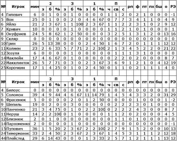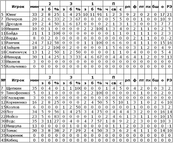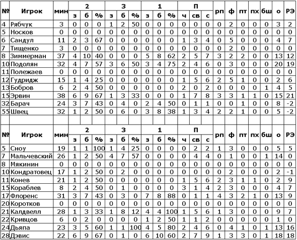 Завершался сегодняшний игровой день матчем в столице, где БК Киев принимал «Кривбассбаскет». Начало матча осталось за «волками», результативная игра Эрвина и Барача в дебюте первой четверти обеспечила хозяевам паркета небольшой рывок, который вывел подопечных Черния вперёд на четыре пункта. В составе криворожцев традиционно в роли лидера находился Дьяпа, именно его броски со средней дистанции позволяли «Кривбассбаскету» держаться наплаву. Завершилась первая десятиминутка результативным проходом под кольцо Гудриджа, который сделал счёт 23:19. В начале второго периода «волки», усилиями Подоляна, увеличили разницу до девяти очков, но развить успех не удалось. 2+3 от Мальчевского и результативное соло от Девиса за две минуты до конца первой половины сделали счёт равным – 34:34, но и на этом гости не остановились, обеспечив себе преимущество в 7 очков ещё до конца четверти. Оставшиеся две четверти команды также провели в напряжённой равной борьбе, инициативой в основном владели гости, но преимущество «Кривбассбаскета» не было существенным. Два с фолом Зиммермана и очередная трёшка Подоляна перед заключительным игровым отрезком сделали отставание БК Киев минимальным – 58:59. Уже в дебюте следующей четверти Подолян тем же способом вывел свою команду вперёд – 61:59, но вернуть всё на свои места, довольно быстро, удалось всё тому же Девису. Концовка матча получилась достаточно напряжённой, киевляне довольно часто фолили, чем и воспользовались гости, безошибочно реализовывая броски с линии. Очередной точный штрафной от Флоренса установил окончательный счёт противостояния – 74:81.