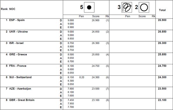Испания. 5 Balls - : 26.900 (Difficulty : 9.000, Artistic : 9.000, Execution : 8.900). Rank : 1