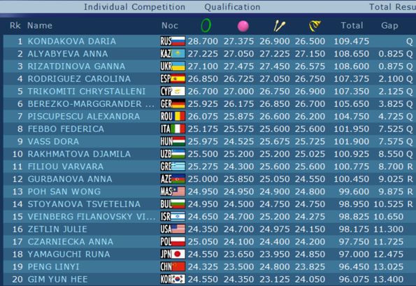 Анна Алябьева, Казахстан. Третья позиция после первого дня. Лента: 27.150 (Difficulty : 8.950, Artistic : 9.150, Execution : 9.050) Total : 108.650.