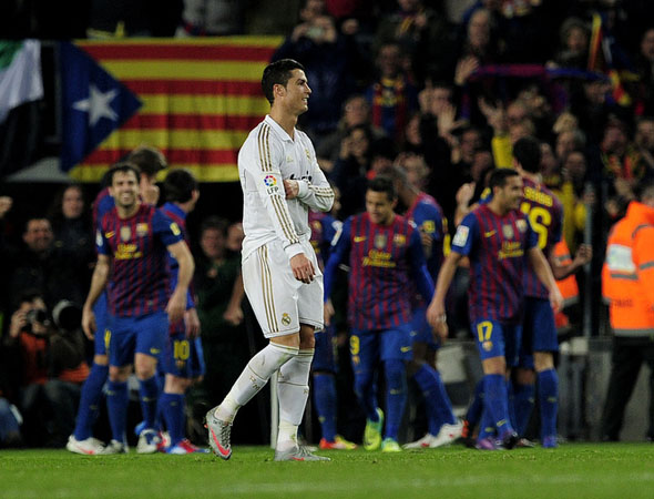 Уже на первой минуте Игуаин выскочил один на один с Пинто, но не смог переиграть кипера соперников. Через несколько минут уже Роналду оказался на ударной позиции, здорово пробивал, но мяч прошел рядом со штангой. «Сливочные» словно и не заметили, что вышли на «Камп Ноу», и продолжали вести себя по-хозяйски. Каталонцы, не то чтобы опешили от такого начала, но их действия были несколько сумбурными и сводились к разрушению начинаний мадридцев. В результате «Барселоне» все же удалось взять игру под контроль, передвинуть ее в центр поля, но вот в атаке ничего острого хозяевам создать не удавалось. Чего не скажешь об их оппонентах. На 25-й минуте «Реал» обязан был забивать. Месут Озил получил мяч перед штрафной, успел остановиться (вот он вопрос к защите каталонцев), оценить ситуацию и пробить. Целил в дальний верхний угол, но попал в перекладину. Минутой спустя оборона «Барселоны» вновь сплоховала. Абидаль попытался сыграть на Пинто, но не совсем удачно и мяч достался Игуаину. Вот только аргентинец с убойной, казалось бы, позиции пробил во вратаря.