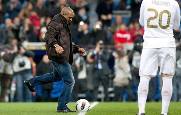 Защитник «Анжи» Роберто Карлос нанес символический удар по мячу перед матчем 23-го тура чемпионата Испании «Реал» — «Леванте» (4:2).