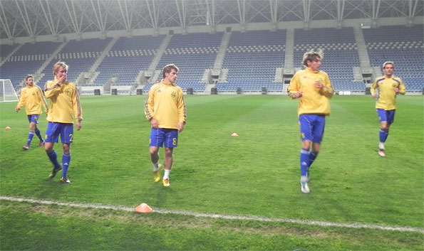 После пресс-конференции главного тренера по традиции следует тренировка, 15 минут которой открыты для прессы. Наши футболисты разминались с охотой, растягивались, активно играли в «квадрат». Правда, Милевский с Алиевым и здесь умудрились устроить короткую перепалку – игроки киевского «Динамо» не сошлись во мнениях о том, кто должен зайти в центр «квадрата».