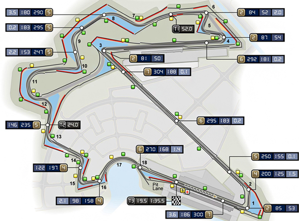 Друга частина азійських мандрів розпочнеться з нічного Гран прі вулицями Сінгапура. Траса, яка теж проектувалася як «східне Монако» вийшла зовсім іншою, але родзинку їй додає те, що протягом трьох днів пілоти їздитимуть за умов штучного освітлення. Дебютувавши у 2008-му траса запам’яталася не тільки скандальною перемогою Алонсо, а й неперевершеною телевізійною картинкою. Це перша з чотирьох в календарі трас, де рух відбувається прои годинникової стрілки. Як і будь-яка класична міська траса, Сінгапур практично не пробачає помилок, а ще тут складно обганяти, але можливо, насамперед у 7-му повороті, меншою мірою у 1-му та 14-му. Гонки на цьому кільці завжди різні та неоднозначні, цікаві чергуються з нудними, і ніколи не знаєш чого очікувати на цей раз.