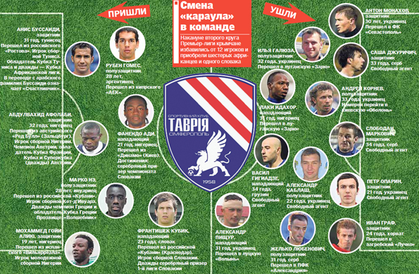 Сам Дмитрий Васильевич в комментарии «Сегодня» назвал сообщение ложью — никто никого не заставлял делать что-либо из-под палки. И пояснил, что, во-первых, прекращение договоров связано с омоложением состава СК (многие покинувшие его «взяли планку в 30 лет»), во-вторых, у тех, кто ушел, появилась мотивация доказывать свою боеспособность. «Есть такое понятие «засиделись» — тот же Любенович пять лет у нас был. Теперь у ребят в новых командах есть дополнительный стимул работать над собой. Но я ни в коем случае не хочу сказать о ком-то из них плохо: дай Бог им удачи и счастья! — подчеркивает вице-президент. — Что касается новичков, то одни только Фанендо Ади, Франтишек Кубик, Марко Нэ, Анис Буссаиди сразу усилят «Таврию», Гомес также покажет отличный результат. Тем более все они знакомы с украинским и российским чемпионатами, им не нужна адаптация. Рабиу Афолаби будем постепенно подпускать к основе. Мохаммед Алию — молодой парень, взят на перспективу. Все приобретения — качественные. Летом продолжатся изменения: мы идем в развитии клуба шаг за шагом». Кстати, спортивным клубом также заключено соглашение о сотрудничестве со швейцарским специалистом Пьером Андре Шурманом, который сегодня возглавит молодежку крымчан, сменив на тренерском мостике Валерия Петрова.