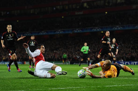 Вот с таким же пониманием ситуации на поле, очевидно, вышли и «россонери». Ибо они были лишь бледной тенью самих себя времен первого матча, зато «Арсенал» преобразился, взял игру под контроль и повел в счете уже на 7-й минуте. Алекс Чемберлен навесил с углового и Лоран Косьелни головой переправил мяч в ворота Аббиати. Несколько минут спустя суперсейв кипера «Милана» спас гостей от второго гола. «Россонери» попытались отодвинуть игру от своих ворот и навязать сопернику борьбу в центре поля. Получилось, хотя и не надолго. «Канонирам» нечего было терять, и они шли вперед. Росицки и ванн Перси вышли на ворота «Милана», но голландца на доли секунды опередил самоотверженный Аббиати. А через несколько минут вратарь гостей вновь выиграл дуэль у Робина, вытащив мяч из «девятки» после его удара. Где при этом были защитники «Милана», которые позволяли «канонирам» бить откуда не пожелается, не ясно, а уж об атаке «россонери» в первом тайме и не вспоминается. Один Ибрагимович время от времени пытался нарушить покой Щестны, но попытки так ни во что толковое и не переросли.