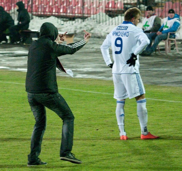 Про Кривбасс: да, очень быдляцкое поведение, но нельзя доводить до таких маразмов, остановить игру, клуб наказать потом и всё. В Европе так делают. Но вопрос в другом, почему киевским болельщикам дозволено на всю страну орать матерные речёвки в адрес руководства страны, а болельщикам Кривбасса нельзя показывать палец Ярмоленко? Тут срабатывает принцип "как аукнется, так и окликнется", ведь быдляцкий тон болельщикам задали именно болельщики Динамо!