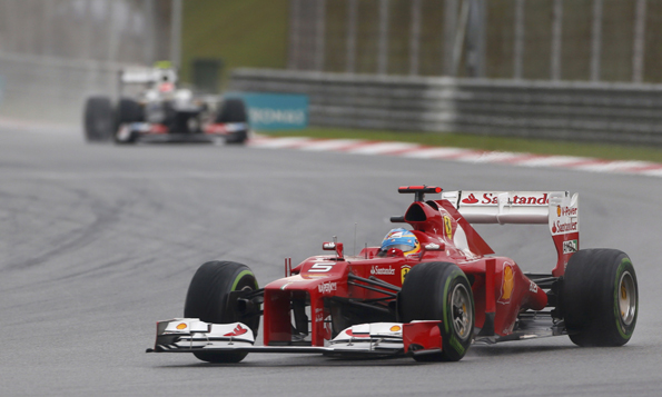 Поки траса була вологою Алонсо зумів наростити комфортний відрив від Переса у 9 секунд, саме цікаве, що сам Серхіо також відривався від Хемілтона, хоч і не такими темпами. Але як тільки малайзійський асфальт став підсихати ситуація змінилася вкрай несподівано для багатьох – мексиканець став їхати на 0,5 – 1 секунду швидше Фернандо і ще більше «привозив» Льюісу. С31 під управлінням 22-річного пілота методично штампував одне найшвидше коло за іншим і перевага Алонсо упевнено продовжила танути мов сніг на весінньому сонці.