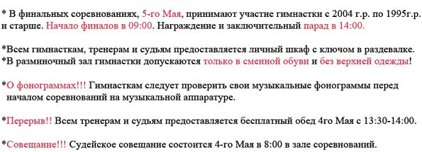 Победительницы и призеры награждаются кубками, медалями, дипломами и призами. Все участницы получат памятный кубок, грамоту и подарок. Турнир будет проходить в два дня. 4 мая пройдут соревнования в многоборье. На следующий день восемь лучших гимнасток по итогам квалификации в каждой возрастной группе разыграют медали в финалах. (Подробнее смотрите Положение о соревнованиях).