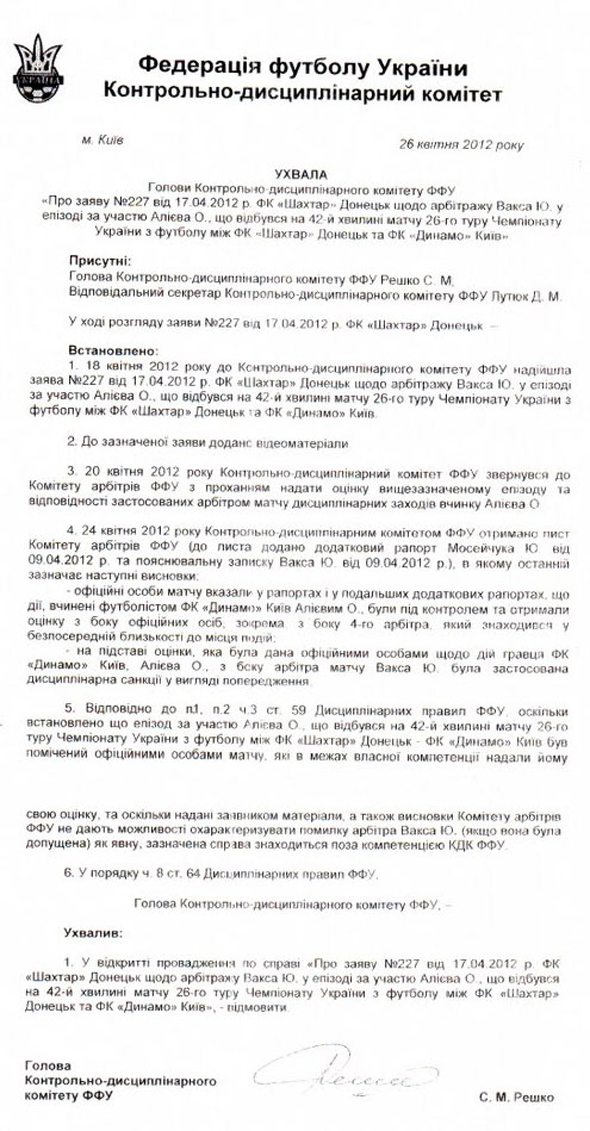 Контрольно-дисциплинарный комитет Федерации футбола Украины рассмотрел заявление ФК «Шахтер» по судейству Юрия Вакса в эпизоде при участии Александра Алиева, который случился на 42-й минуте матча «Шахтер» - «Динамо».