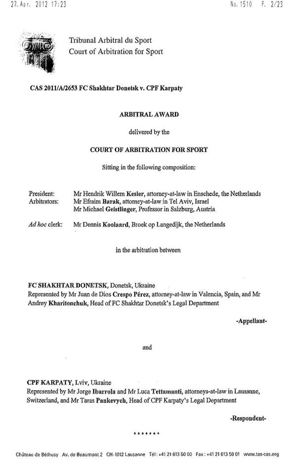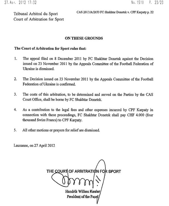 27 квітня 2012 року Спортивний арбітражний суд Лозанни прийняв рішення у справі CAS 2011/A/2653 FC Shakhtar Donetsk v. CPF Karpaty, яким відхилив апеляційну скаргу ФК «Шахтар» на Рішення Апеляційного комітету Федерації Футболу України від 23 листопада 2011 року та залишив останнє в силі (нижче – сканкопія першої та останньої сторінок рішення CAS).