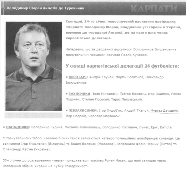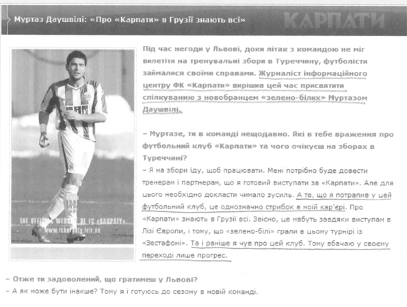 Речь пойдет о новоиспеченном полузащитнике львовского клуба Муртазе Даушвили, история перехода которого из скромного клуба «Зестафони» в «Карпаты» обретает совершенно немыслимые повороты: от официальных версий подписания контракта с «зелено-белыми» до его трансфера в ФК «Львов» и последующей аренды в «Карпаты». Но обо всем по порядку...