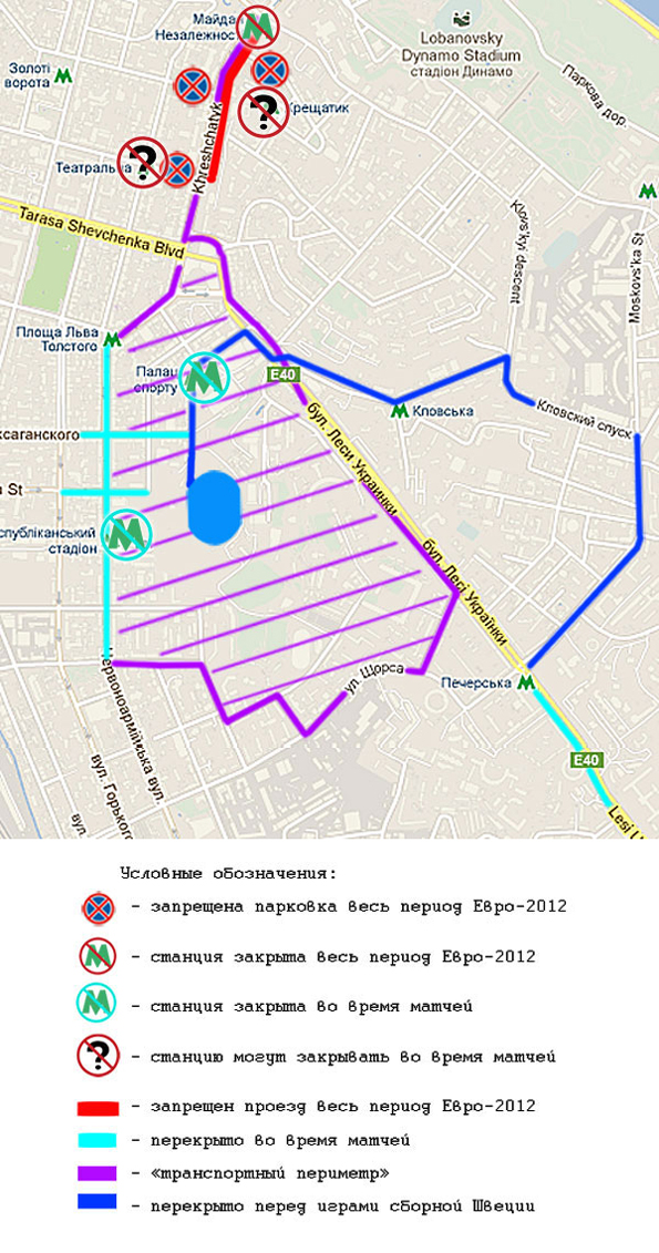 Кроме того, с полуночи 7 июня до 6:00 утра 2 июля будет закрыт выход со станции метро Майдан Незалежности. В дни матчей будут закрывать «Олимпийскую» и «Дворец спорта». Возможно, такая же судьба постигнет и станции «Крещатик» и «Театральную».