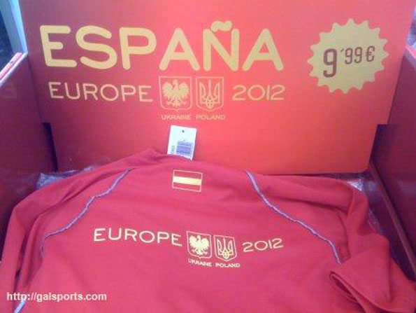 Іспанці продають футболки для своїх вболівальників які приїдуть на Євро до Гданську(спешил для не знаючих, Гданськ - Польша), там буде грати їх збірна, так от для ізюминки вирішили, крім традиційних кольорів збірної Еспанії)))) прималювати ше герби з написами країн-господарів, поляки тут тільки одним боком, як дехто тут зауважує нашим було би пофіг, а поляки все таки на відміну від багатьох українців, своє поважають, і герб і прапор, і гімн і мову - їм не пофіг