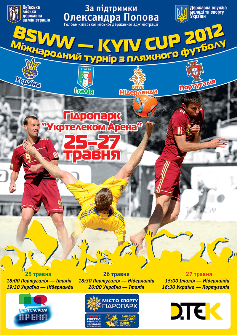 Соревновательный сезон на День Киева 25-27 мая открывает первый профессиональный международный турнир в Украине пляжного футбола «BSWW Kyiv Cup 2012» с участием сильнейших национальных сборных команд мира Португалии и Италии, а также Голландии и Украины.
