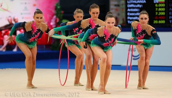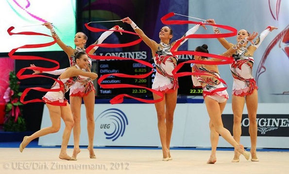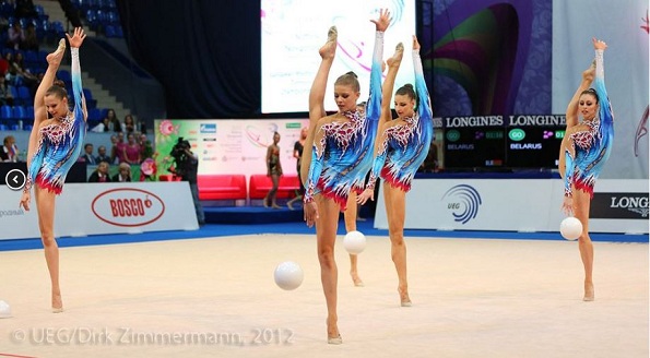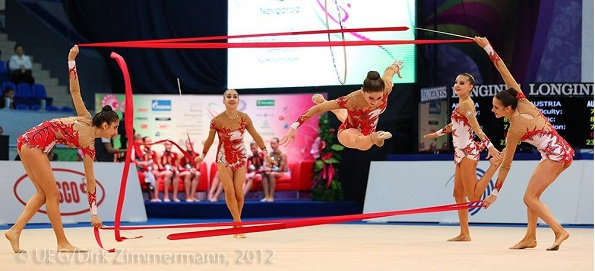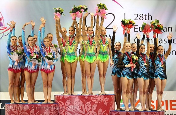 Церемония награждения в групповых упражнениях, многоборье (на первом месте команда России, на втором - Беларусь, на третьем - Италия)