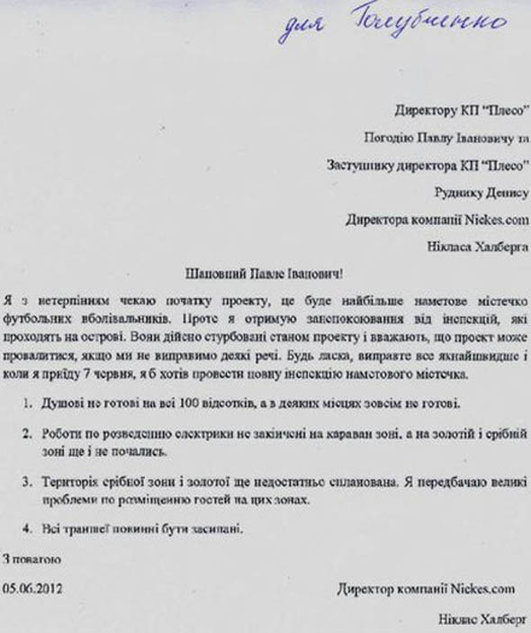 Об этом говорится в письме директора компании Nikes.com Никласа Халберга к начальнику КП «Плесо».