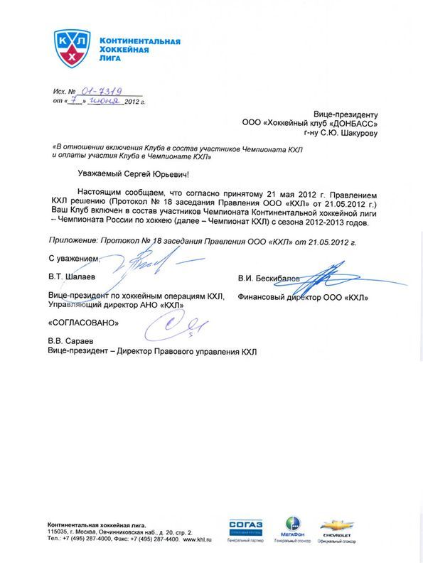 То, о чем ранее говорил Президент Континентальной хоккейной лиги Александр Медведев - свершилось. 7 июня в офис хоккейного клуба «Донбасс» пришел официальный документ КХЛ. Теперь можно смело говорить о том, что ХК «Донбасс» стал участником сильнейшей хоккейной лиги Европы.