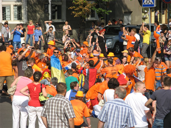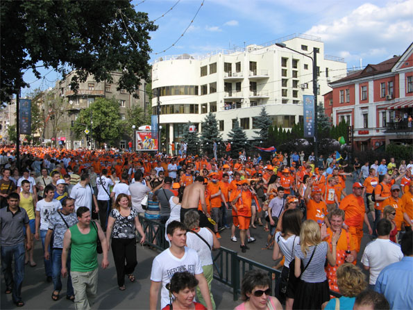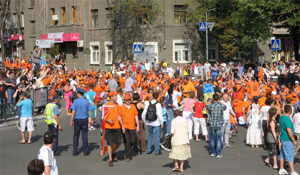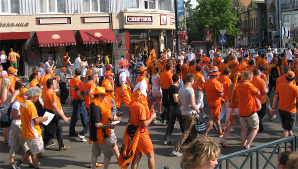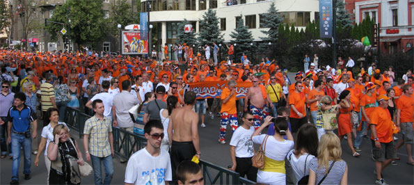 Голландцев в Харькове заметно больше, чем датчан. Сегодня поклонники сборной Голландии устроили в Харькове шествие, собравшее не меньше 10 тысяч человек. И зрелище получилось невероятно красочным!