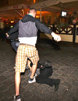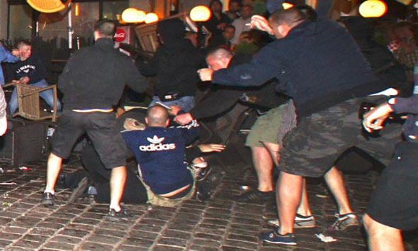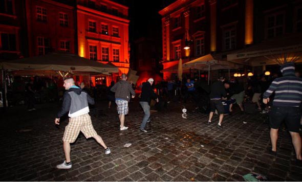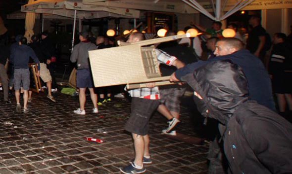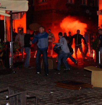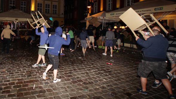 Минувшей ночью в самом центре Познани произошла массовая драка, которая началась со словестной перепалки и переросла в побоище с использованием стульев, бутылок и прочих подручных средств. Спустя пять минут после начала стычки вмешалась полиция, в результате чего было задержано 14 болельщиков, среди которых 10 поляков, 3 ирландца и 1 хорват.