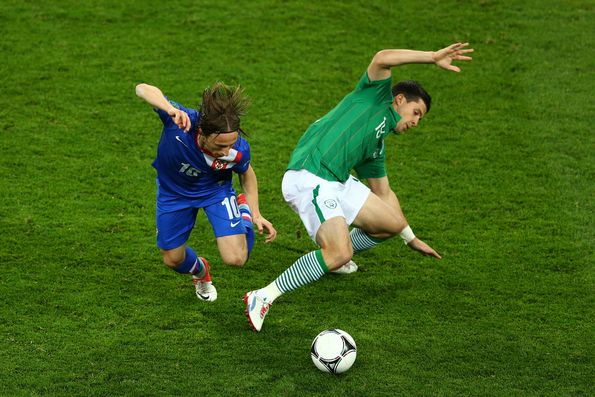 Пропустив, хорваты продолжили играть в том же ключе, что и до гола. Несколько раз оборона Ирландии трещала по швам, но каждый раз гордые ирландцы находили в себе силы отбиться. Возможно, тайм бы так и закончился ничейным результатом, если бы не весьма спорное решение голландского арбитра Бьорна Кейперса. Дальний удар Модрича после серии рикошетов отскочил к одинокому Елавичу, который ударом с близкого расстояния не оставил шансов Гивену. Все бы хорошо, но в момент удара Модрича Елавич был в офсайде…
