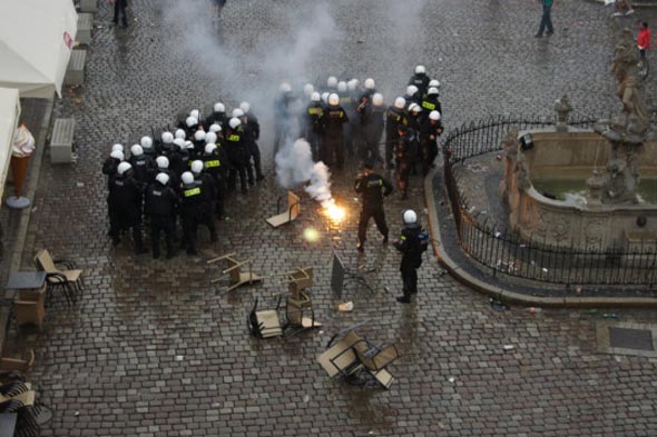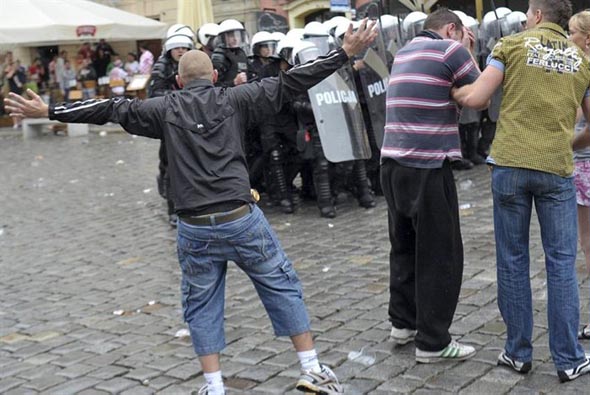 Менты польские задерживают людей причастных к метанию и разжиганию дымовых шашок, из за этого и конфликты! Думаю у нас на это закроют глаза, побоятся менты вязать иностранцев, менталитет не тот!