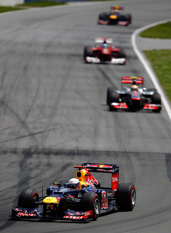 На цей раз ситуація була схожою, але зі своїми нюансами: Льюіс Хемілтон не став лідером гонки після старту, але і не дав Феттелю від’їхати на безпечну для німця відстань. Надалі ж ситуація виникла доволі цікава – багато хто звик до того, що більш ранній піт-стоп порівняно з суперником, з яким ведеться боротьба за позицію, дає перевагу, але схоже, що у випадку коли в гонці використовується пара Soft – SuperSoft цієї тенденції немає. Так було два тижні тому в Монако, так само було і в Монреалі – свіжий комплект Soft прогрівався трошки довше, а тому зайве коло на зношеному комплекті давало перевагу. Це дозволило Льюісу, який пересидів Себастіана на одне коло, випередити німця, так само і Алонсо за два зайвих (порівняно з Хемілтоном) кола зумів ліквідувати відставання і також випередити обох конкурентів. Інша справа, що непрогріті шини на F2012 не дозволили Фернандо встояти в боротьбі з Льюісом. Проблему з непрогрівом не можна недооцінювати – всі члени команд говорять про те, що у випадку агресивного пілотажу на перших колах використання комплект може зноситися занадто швидко, а отже пілоти змушені не тільки їхати швидко, а робити це так, щоб не зносити шини раніше запланованого.