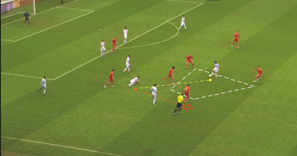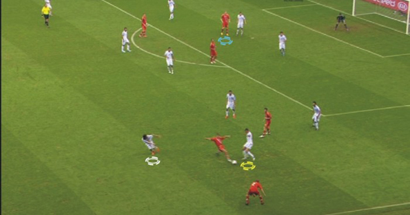 Начало атаки сборной России. Проблемы прохождения первой линии обороны Греции уже в составе 5 игроков, где Игоря Денисова (с мячом) атакуют Самарас (белый) и Холебас (желтый). Секундами ранее Павел Погребняк (синий) просил подать на него верхом.