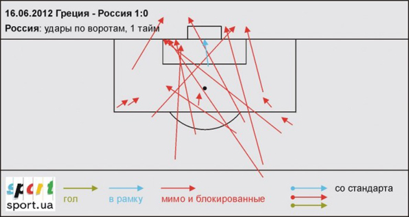 Несомненно, сборная России владела подавляющим территориальным и игровым преимуществом на протяжении 70 минут матча. Однако потрясающе низкая точность передач и ударов, малая подвижность креативных игроков не позволила пройти организованную оборону Греции. За весь первый тайм сборная России сумела нанести лишь 1 удар в створ ворот Греции.