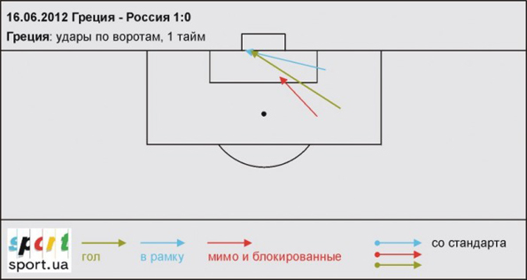 Удары преимущественно наносились из–за пределов штрафной площадки, и они были на 100% неточны. В тех же редких случаях, когда обладатель мяча оказывался с ним в штрафной, защита греков почти всегда успевала их блокировать.