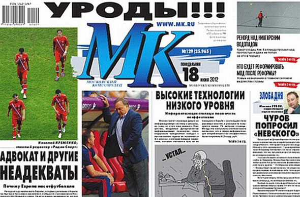 Обидное слово в заглавии первой страницы газеты «Московский комсомолец» адресовано сборной России по футболу. Также на титуле содержится фотография игроков сборной с припиской «Адвокат и другие неадекваты». Как только номер поступил в продажу, снимок обложки МК начал гулять по Интернету, попав в самые топовые блоги и сотнями ретвитов вскоре распространился по всему Рунету.