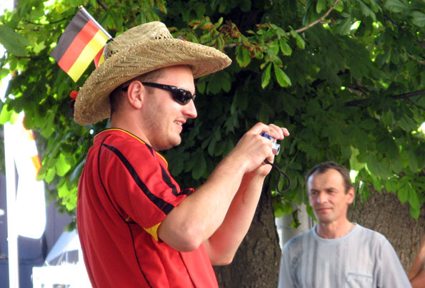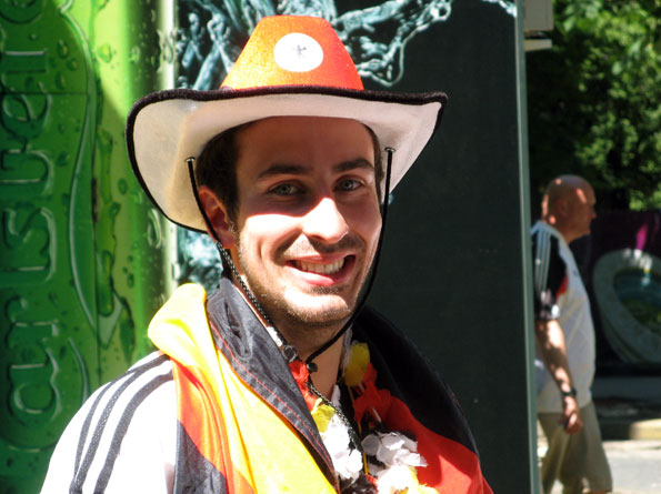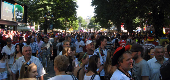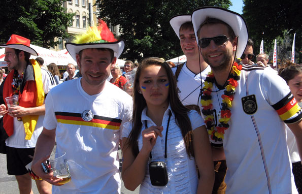 Противостояние фанатов из Германии и Дании, которое выражалось в том, кто красочней и оригинальней представит свою страну – костюмом или песней - носило очень дружелюбный характер. Со всех сторон доносился традиционный немецкий «Prost!» и парни в бело-черных футболках радостно чокались пивными кружками с ребятами в красно-белых одеяниях.