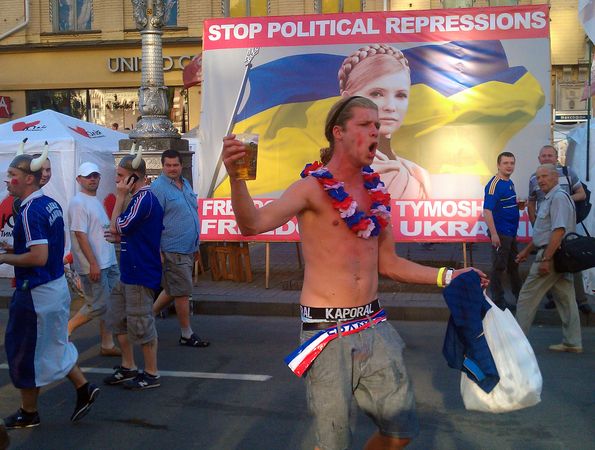 Киевская фан-зона остается самым притягательнвм местом для тех, кто вторую неделю живет большим футболом - турниром Евро 2012. Вчерашний вечер не стал исключением. Тысячи разношерстных болельщиков в ожидании двух последних матчей нашей группы разгуливали во Хрещатику, общались, пели, танцевали, веселились и, конечно же, пили пиво.